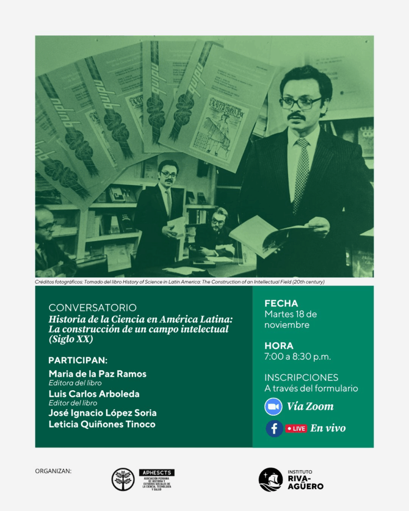 El Instituto Riva-Agüero (PUCP) y la Asociación Peruana de Historia de la Ciencia, la Tecnología y la Salud (APHESCTS) invitan al conversatorio en torno al libro History of Science in Latin America: The Construction of an Intellectual Field (20th Century), editado por María de la Paz Ramos-Lara y Luis Carlos Arboleda.