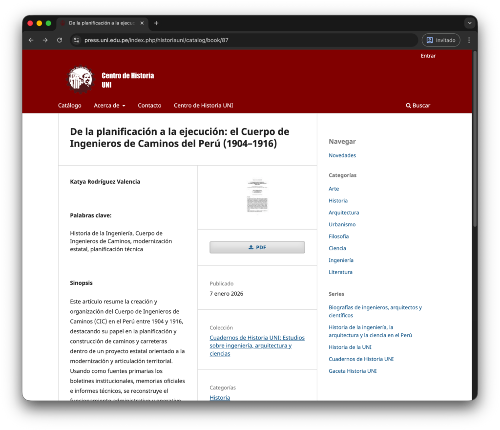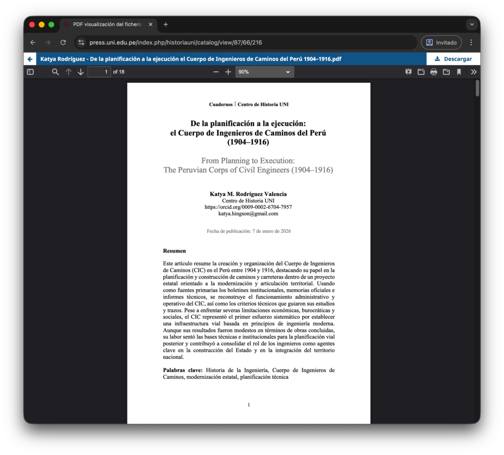 Este artículo analiza la creación y funcionamiento del Cuerpo de Ingenieros de Caminos, el primer intento sistemático del Estado peruano por construir infraestructura vial bajo criterios de ingeniería moderna. A partir de boletines institucionales, memorias oficiales e informes técnicos, se reconstruyen sus métodos de planificación, trazado y gestión, así como las limitaciones económicas y burocráticas que enfrentó.